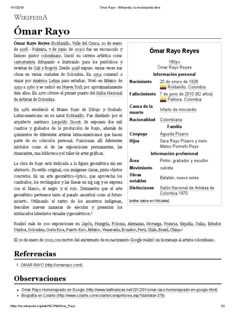 Omar rayo reyes nació el 20 de enero de 1928 omar rayo art. Nació en el municipio de roldanillo, valle del cauca, colombia, el 20 de enero 1928, hijo primogénito de vicente rayo y maría luisa reyes, cursó por correspondencia sus primeros estudios de dibujo en una academia de buenos aires, en 1947 se radicó en la ciudad de santiago.